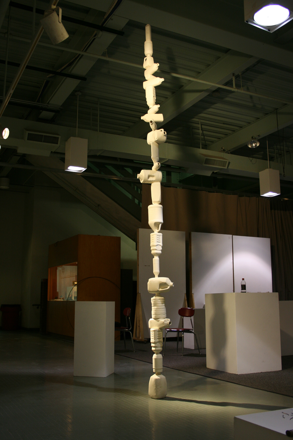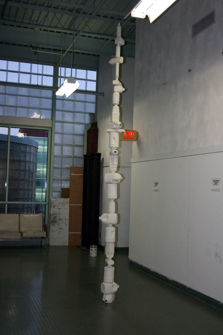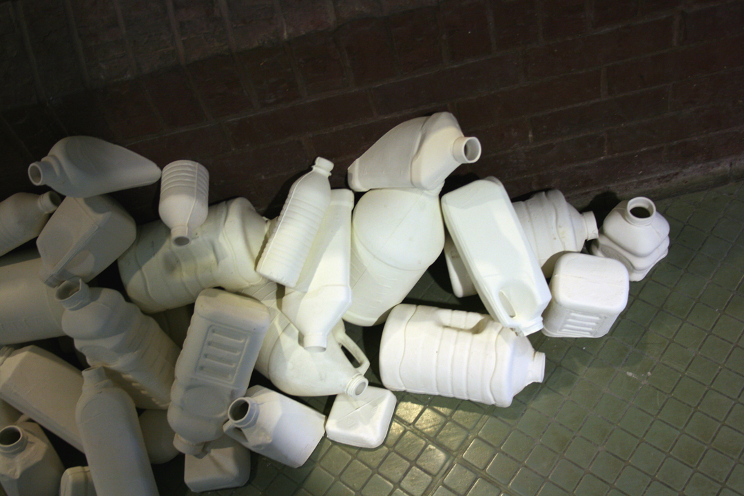 Between 2007 and 2009 I worked on a series of Installation pieces constructed with hundreds of ceramic bottles made with casting slip and plaster molds taken from 14 different plastic bottles. I spent an entire summer producing the molds and over 1000 ceramic objects.